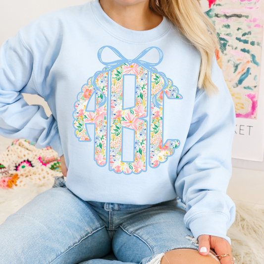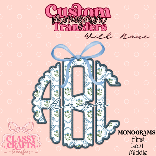 Blue & Pink Floral Coquette Bow - Custom Monogram Transfer